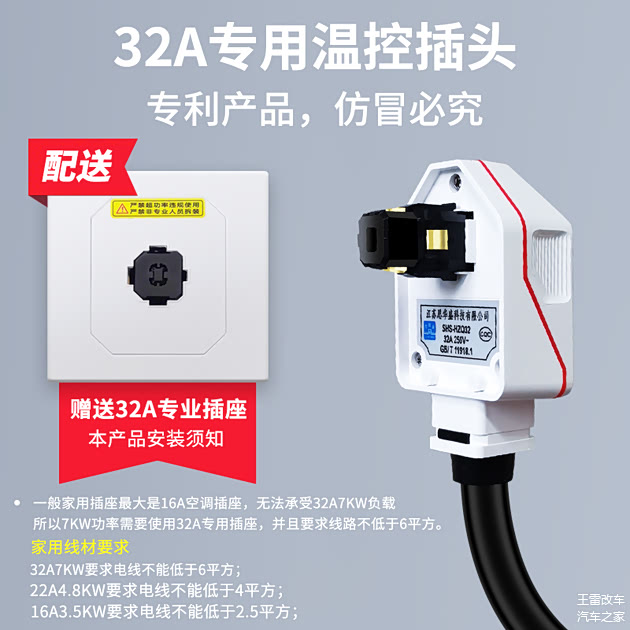 所以如果想要使用32A7KW的充电设备,就需要单独布线,没有直接插家用插座。目前普诺得推出一款32A7KW便携式充电桩。此款充电器采用32A专用插头插座。可以实时监测到充电时的温度。在充电的过程中,如果检测到插头温度超过85度,会自动停止充电,保证使用安全。笔者研究了很多32A7KW的充电设备,目前只有普诺得这款充电器具备此功能。