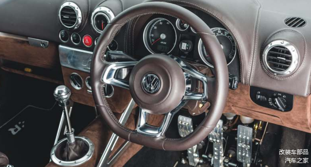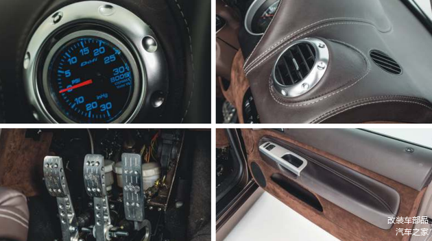 内饰方面,移植奥迪TT仪表台,MK4 R32 时钟,奥迪RS4座椅,MK7 高尔夫 GTI 方向盘。全车奥迪风格内饰重新包覆,定制太妃糖灰色真皮和Alcantara翻毛皮搭配。Defi 涡轮压力表,并且全车拆除冷热空调系统。