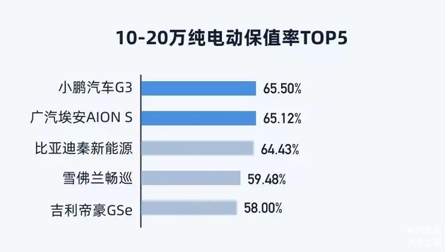 而10-20万榜单的最终成绩中,最明显的特征就是接近一致的平均性,小鹏G3/Aion S/秦EV等以两两之间微弱的差距占据前三名,第四和第五的雪佛兰畅巡/帝豪GSe虽说有一些差距,但一年残值率也双双超过了58%。