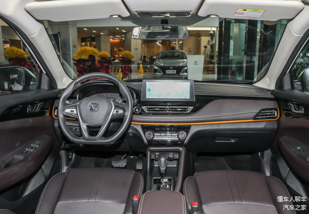 进入长安逸动DT车内,配色上采用双色方案,看上去挺年轻,在中控区域可以看到一条金黄色的贯穿装饰条。作为一款入门车型,中控区域采用大量软性材料覆盖,质感不错,中控屏幕是悬浮式设计,尺寸在10.25英寸,就是左右两侧黑色边框相对大一些,支持手机互联,但没有提供车联网以及语音控制。往左侧去看,仪表屏是组合式设计,左右两侧是双圆盘,中间是一个单色3.5英寸液晶屏,信息显示挺齐全,正前方搭载皮质方向盘,可以进行上下调节。