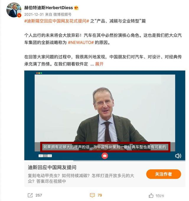 但最近这位大众总裁在微博回答中国网友的提问的时候,回答道:“如果拥有足够大的呼声的话,为中国特别复刻一款经典车型也是有可能的”,对比键盘君认为,甲壳虫的电动化是非常有可能的,毕竟像Smart和Mini也在积极的电动化转型和国产,加入把纯电甲壳虫国产,采用大众最新的MEB平台,就用ID.3的电池和电机即可,续航做到400km左右,售价做到20万左右,相信还是有不少颜值党为其买单。