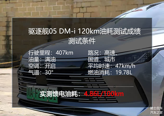完成测试后,驱逐舰05累计行驶407km,平均时速47km/h,此时表显续航里程为734km,按照出发时1125km计算,实际出入仅为16km,消耗燃油19.78L,最终百公里馈电油耗为4.86L。当然,如果是单人驾驶,且满电满油,相信和官方公布的3.8L的百公里油耗差距也不会太大,日行1000km以上肯定不成问题。