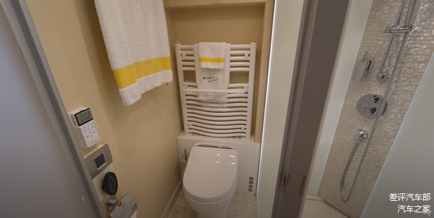 接下来,房车中段是洗漱区:全功能的智能马桶、加热毛巾架、定制的洗澡花洒。。。