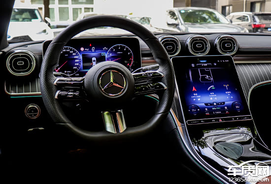 新款奔驰C级的内饰风格依然定义为“浮岛式”结构,配备12.3英寸全液晶仪表盘以及11.9英寸中控屏,两者均为悬浮式设计,营造出很强的科技感。目测来看屏幕分辨率相当高,显示效果清晰细腻,得益于合理的位置布局以及倾角的细节考量,在正常使用过程中,基本不会出现明显的反光情况。系统UI设计动感写意,不过功能显示却非常直观易懂,美观之余也照顾到了不错的实用性。