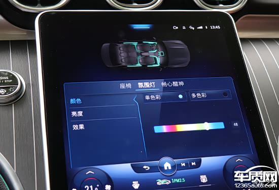 车内64色环境氛围灯支持多种调节,包括单色、多色彩、亮度以及效果均可进行设置,可玩性非常高。另外,新款奔驰C级的内饰氛围灯布局设计也非常考究,显得特别有高级感。座舱场景模式选择丰富,细节设置也相当丰富,而且还可以分别对驾驶员和前排乘客进行单独设置,用户体验感很好。