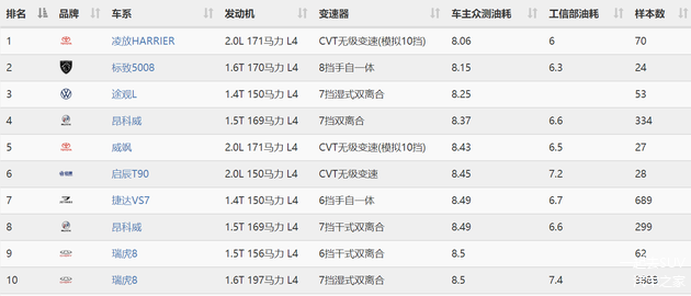 中型SUV节油榜第1名为一汽丰田凌放(8.06L/100km),与第5名的广汽丰田威飒(8.43L/100km)为兄弟车型,从工信部展示的油耗信息来看,威飒就已经比凌放高了0.5升,所以反映到车主油耗的差距还是比较真实的。