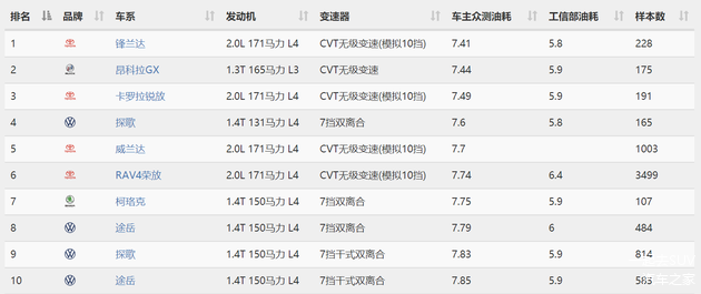 纯燃油版的紧凑型SUV前10名的几乎是丰田系和大众系的天下,只剩下一款别克车型在瑟瑟发抖。当然榜单并非只有合资车型,只是国产车型没有进入前10,启辰T70以7.97L/100km排名15;风神奕炫GS以8.15L/100km排名23;帝豪GS以8.22L/100km排名26;风行T5 EVO以8.25L/100km排名28。