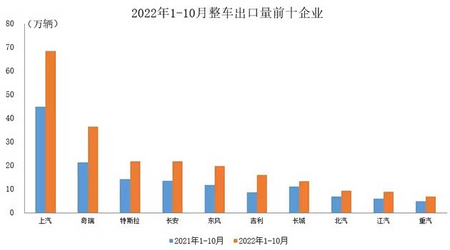 而出口量最多还是上汽乘用车,1-10月份累计出口量达68.4万辆,其次是奇瑞汽车,其年内累计出口量突破40万辆,同比增长70.9%,再一次刷新中国品牌乘用车“出海”新纪录。此外,长安汽车出口量也突破20万辆,汽车吉利出口量达到16万辆,同比增长86%,增速最为明显。