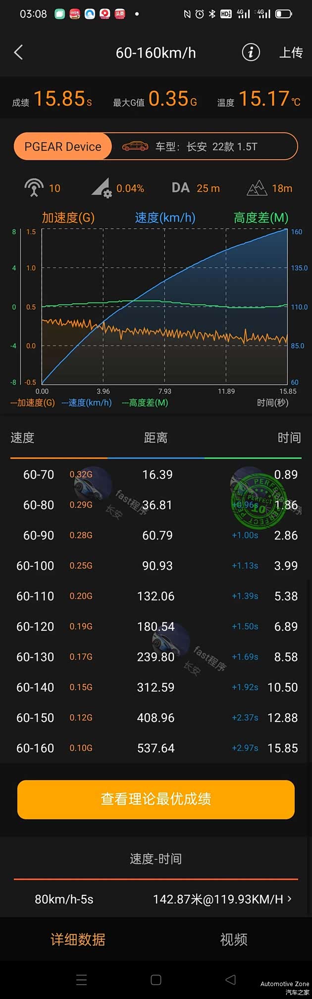 纯原厂状态下95号油品,原厂的60-160的加速成绩是15.85秒,跑了537米,