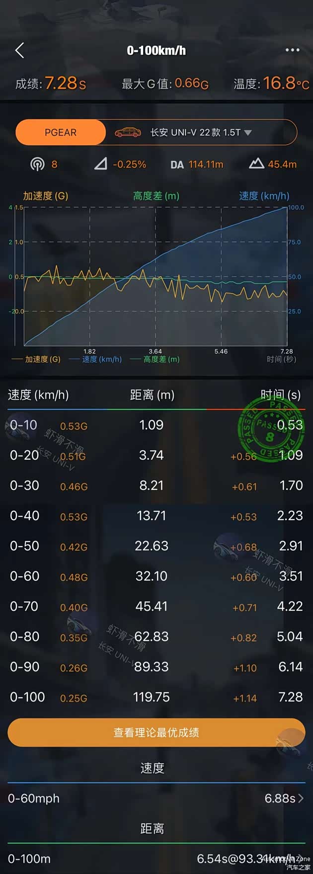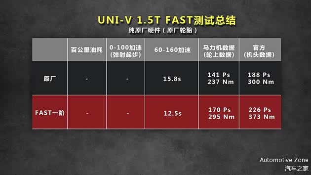 虽然本次我们并没有成功测试它的01加速,但是我们可以大概推演UNIV在一阶状态的的01加速时间,我们在网上查阅到了元UNIV1.5T的原厂加速时间7.2秒,其中60-100的加速时间是3.5秒,然而我们测试一阶段状态下的60-160的成绩当中,其中60-100的加速时间是3秒。由此大概推演出来他的01加速时间是6.5秒出头。
