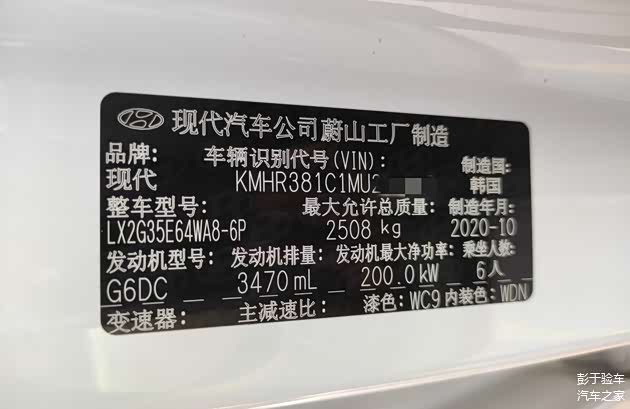 韩国蔚山工厂2020年10月制造,2020年12月上牌,3.5排量,最大净功率200KW,6座,指导价32.98W,卖方售价22.6W。