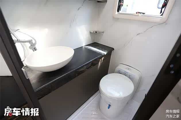 后方厨卫,卫生间门上穿衣镜,出门在外也一定要时刻注意形象哦。内部配有浴帘、淋浴花洒、化妆镜、陶瓷洗脸盆、房车专用固定马桶,吊柜等。