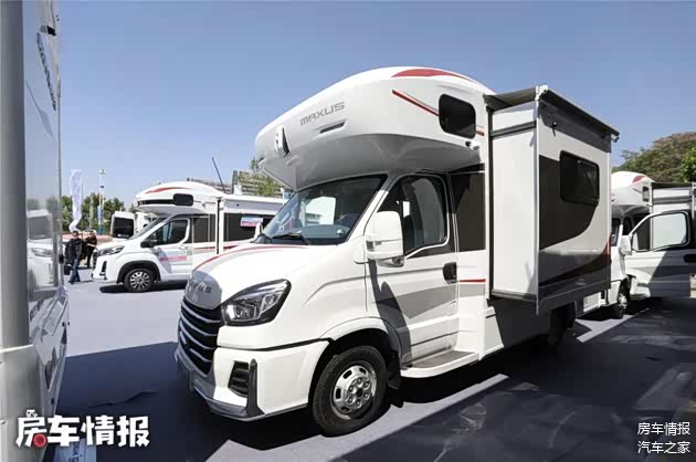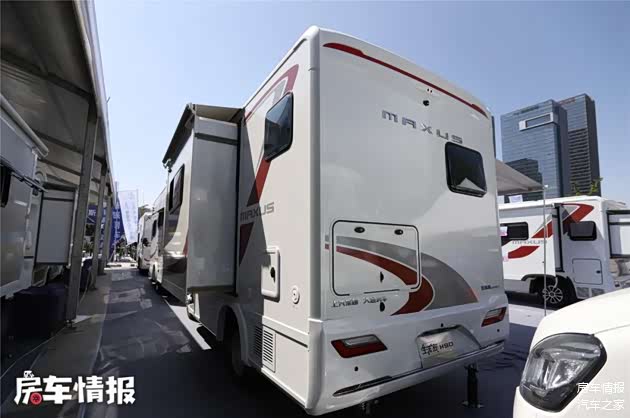 车身外观颜色阿尔卑斯白,在白色的基础上飞舞着红灰拉花线条,活力张扬,车头依然延用MAXUS 家族前脸 。外部配有智能市电口(新能源充电功能),倒车雷达+倒车影像,电动踏步 ,手动遮阳篷等。
