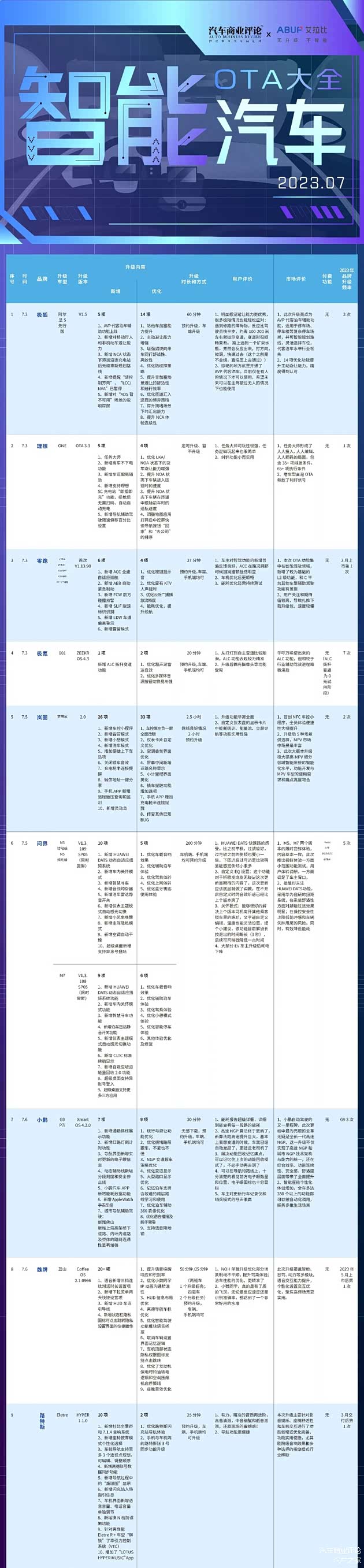 智能化的下半场中,汽车OTA逐渐普及,开始变得像呼吸一样,每个月有至少十余款车型升级。为了记录智能电动行业的每一步跃迁,从2023年7月起,汽车商业评论与艾拉比联合推出主流车企OTA月报。