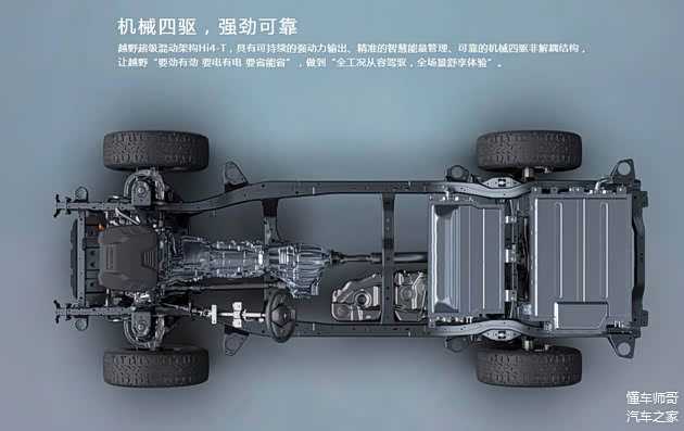虽然坦克品牌的Hi4-T技术,和此前长城汽车发布的Hi4技术仅一字之差,但是系统组成却有很大区别。目前绝大多数新能源SUV实现四驱的方式,都是在车辆的后桥上增加一台驱动电机,包括丰田以及本田在内。长城汽车的Hi4技术同样如此,而坦克的Hi4-T技术则是通过发动机+变速箱+分动箱+传动轴的机械结构,对后轮进行驱动。这样做的好处是,即便在亏电工况下,后轮也能获得足够的驱动力。