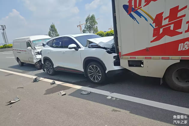 路况不用看也知道是高速状态了,最少也是快速路段,三车追尾倒也没什么疑问,直接就能看出前面第一台是货拉拉的车型,虽说不是重卡,但也是属于中卡范畴了,更头疼的就是这种货车尾部带有附加的升降平板,再加上低端的执行机构,等同于附加了一层更硬实的钢板防护,碰到这样的车型,自求多福吧,这时候速度快慢、整车结构强度缺一不可,但凡少一个因素,都不是现在图中发动机盖卷曲这么简单了。