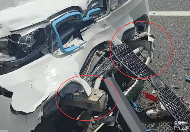 而最为重要的部分则是上图红圈内,发现没有?非承载式的大梁竟然没大事,车壳都溃缩那么多了,大梁还在,这就解释了捷途大圣为何后保险杠被撞的稀烂,后备箱直接溃缩的主因所在了,非承载式车型狠就狠在这里,车壳可能没多少强度,但是你架不住下面两根粗壮的钢管,直接就是硬刚,这要是车身结构软一些,被这么强力一击,溃缩的区域会更吓人。