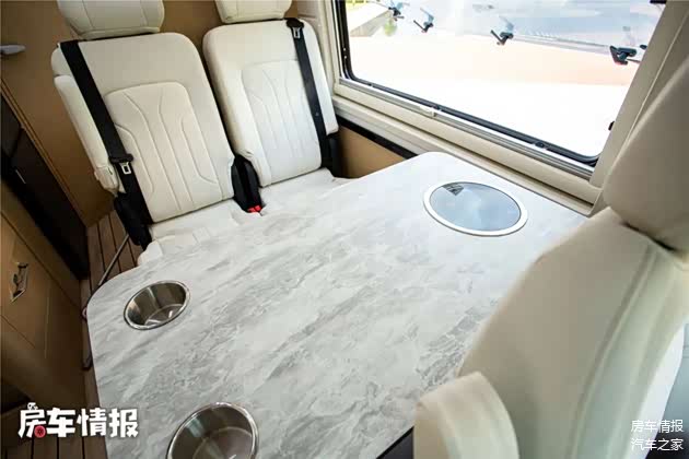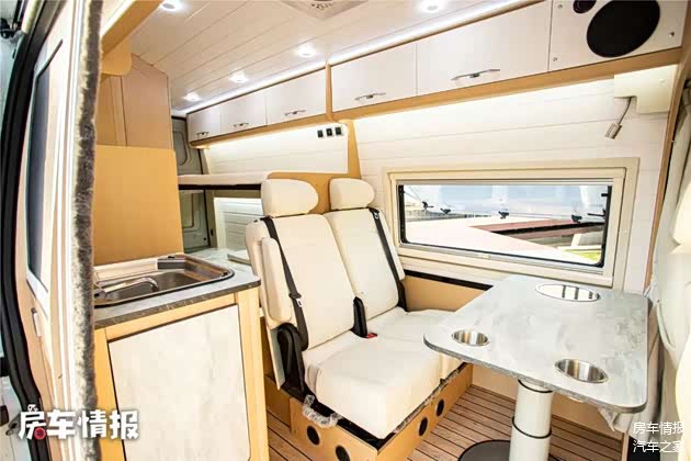 虽然是B型房车,但是生活空间的布局和空间高度都是让人很舒服的,内高达到了182公分,大部分人都可以在车里正常的活动。车内全部采用浅色系家具,整体营造出了很温馨的氛围感。