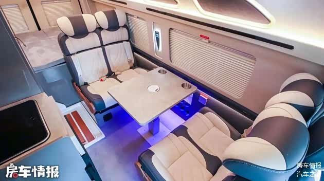 生活区的商务氛围感也是拉满,内部全部采用了软包处理,处处体现精致。中部是一个四人对卡座的布局,整车核载6人。上方也做有储物吊柜,一直延伸至尾部,储物空间还是比较充足的。晚上休息时,卡座区还能变成一张单人床,足够一个成年人睡下。