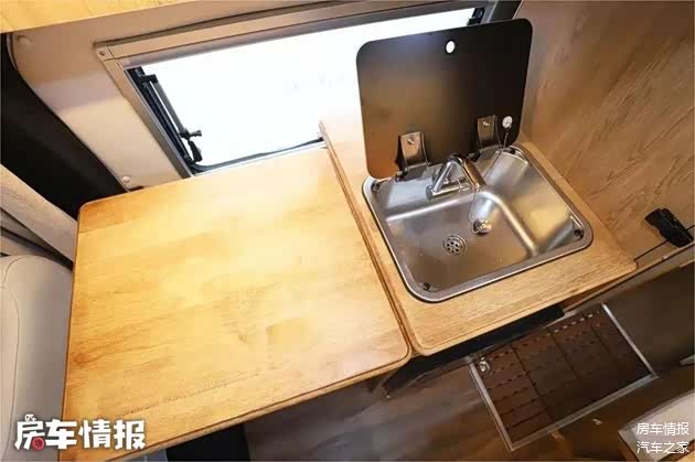 厨房比较简单,台面上配置了一个洗手池,一侧安装了可折叠的拓展板。台面下方是一台50升的车载冰箱,平时可以冰个啤酒饮料或者食材保鲜。