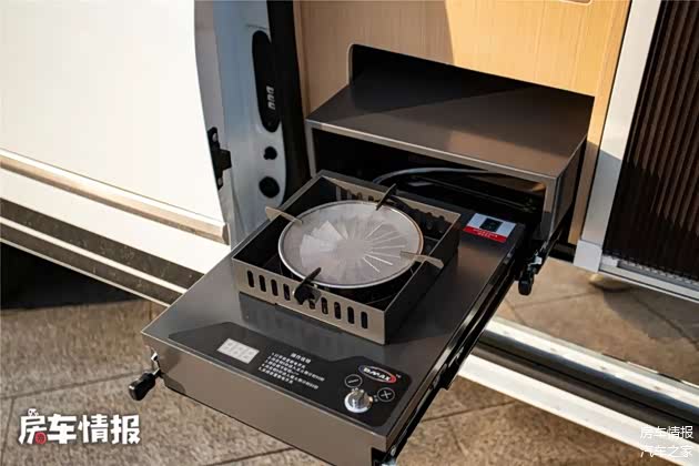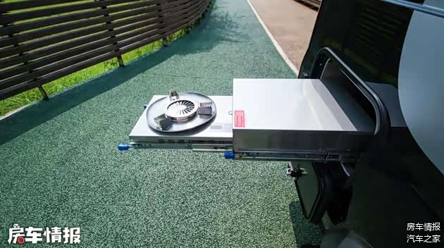车尾部配备抽拉式柴油灶,户外做饭很方便。户外的小桌子也有配备了,拉开中门就能看到内置的户外餐桌!