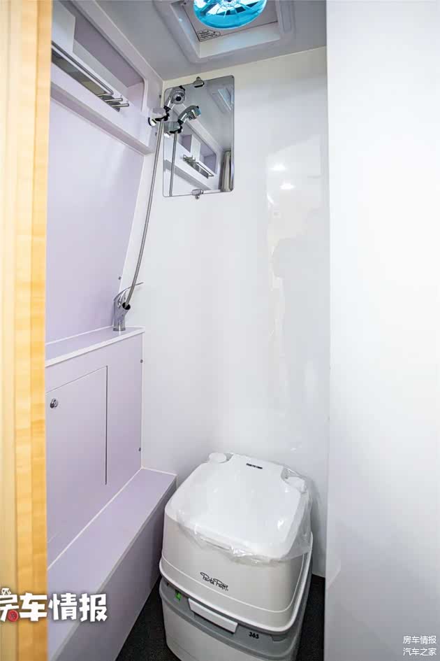 卫生间位于车尾部,内部空间可以满足一个成年人活动,配备了便携式马桶、淋浴花洒等,水路上提供了120升清水箱和23升污水箱,还有驻车加强暖风和金威10kw加热器。