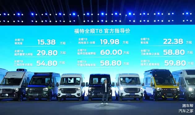 在本次上市发布会上,除了公布15.38万元的起售价格之外,江铃福特全顺还推出了多款房车共创车型,包括江铃福特全顺T8越界露营大师版、江铃福特全顺T8越界四驱越野版、江铃福特全顺T8卫航商旅公务版、江铃福特全顺T8江旅四季全能版、江铃福特全顺T8宇通四海畅享版、江铃福特全顺T8瑞弗五星尊享版。每款房车各具特色,为不同使用场景而生,提供用户个性化的场景解决方案。