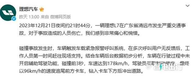 2023年12月21日夜间约21时44分,一辆理想L7在广东省清远市发生严重交通事故。