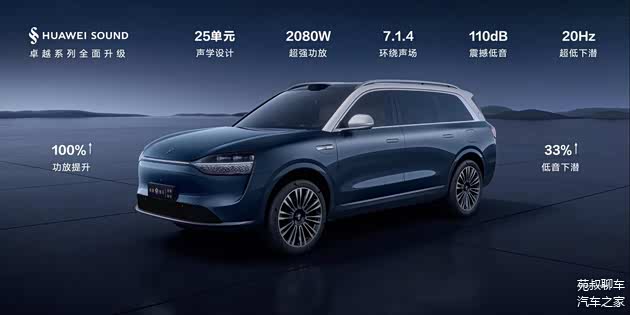 问界M9使用的音响系统为HUAWEI SOUND SUPERIOR卓越系列,全车有25单元的声学设计,功放功率达到了2080W,支持7.1.4环绕声场和110dB低音。