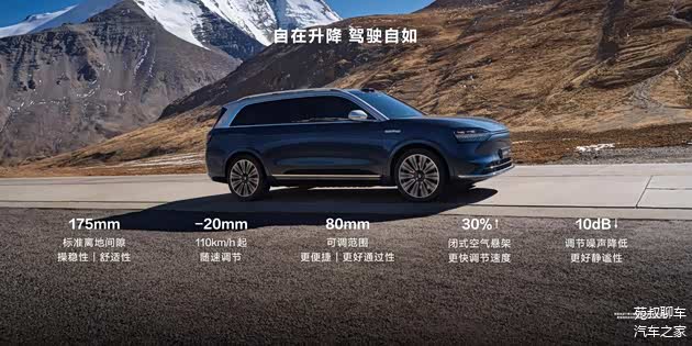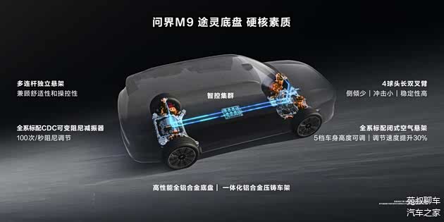 悬架系统上,问界M9使用了途灵底盘,全系标配CDC可变阻尼减振器,全系标配闭式空气悬架,支持5挡车身高度可调,整车使用了高性能全铝合金底盘和一体化铝合金压铸车架,搭配了前4球头长双叉臂与后多连杆悬架。