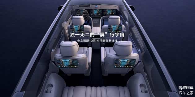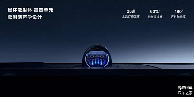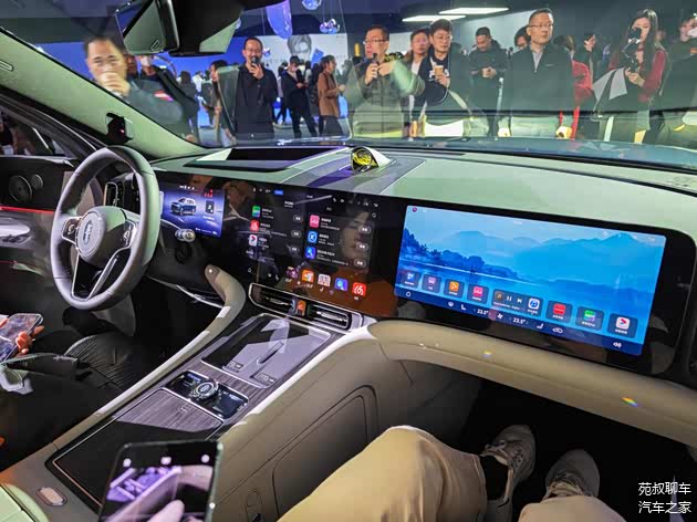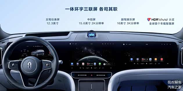 中控台三联屏分别由12.3英寸液晶仪表盘+15.6英寸中控屏+16英寸副驾娱乐屏组成,三联屏上方中央凸起的装置是光影声学AI智慧体“星环散射体”,音响系统就集成在其中。同时前两排座椅后方还配有HUAWEI MagLink接口,能够通过磁吸支架对后排的设备进行拓展,并且基于鸿蒙座舱还能够实现多屏联动交互。