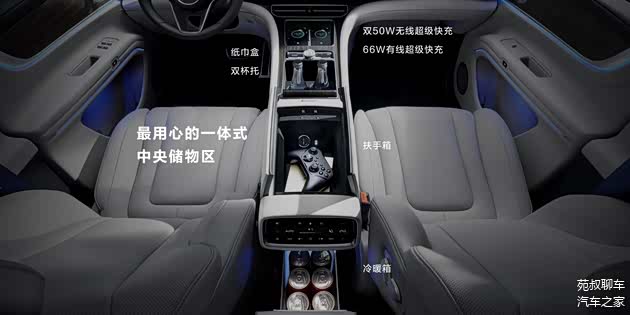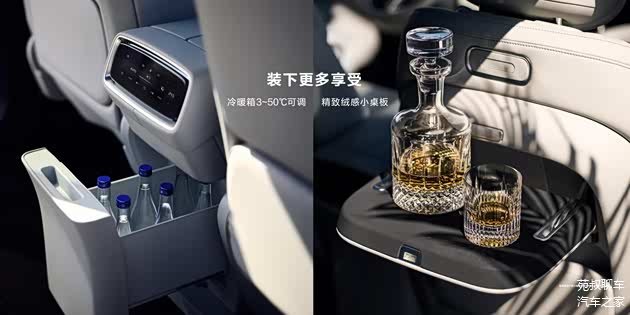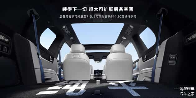 车内其他配置方面,全车共有41处储物空间,中控屏幕下方支持双50W无线快充,扶手箱下侧为冷暖箱,温度从3~50℃可调。主驾配备有隐私储物箱,副驾配备有侧边柜,前后第三排储物空间都相对丰富,满足使用绰绰有余。后备厢方面,支持第三排座椅纯平放倒,放倒后后备厢容积可拓展至716L。
