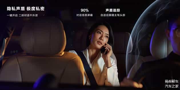 在双层隔音玻璃、整车主动降噪技术、静谧车身结构设计的加持下,问界M9实现了较为出色的噪音抑制能力,同时还有个黑科技——隐私声盾,声盾可自适应跟随主驾头部,开启后第二排谈话声音可以和主驾驶进行隔绝,保证二排对话的私密性。