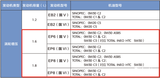 图:标致/雪铁龙旗下车型的使用手册里面,基本不会告知发动机所需机油粘度,这时候我们就需要参考东风标致雪铁龙的《质量担保和保养手册》。从这本东西当中我们可以获知EP6(1.6T)和EP8(1.8T)所需的机油黏度,均为0W-30,只不过需要满足的规格有一定不同。但万变不离其宗,我们只需要根据厂家推荐的黏度寻找机油,基本不会出现问题。