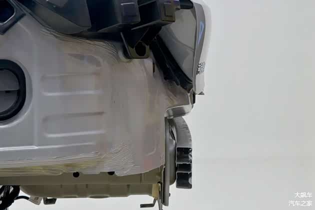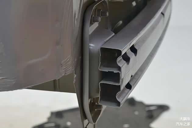 拆掉前保险杠,内部有一根铝合金前防撞梁,厚度为3.60毫米,能覆盖车头的75.68%。