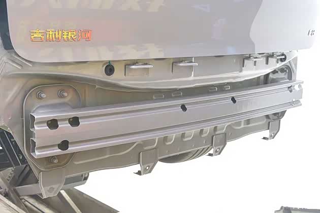 这辆银河E8的前后防撞梁,基本延续了浩瀚平台的高规格设计,和沃尔沃、Smart、极氪比较相似,前防撞梁使用了铝合金材质,还做了溃缩诱导,这在一般车上并不多见,半米长的吸能盒更是罕见,是浩瀚平台的显著特征。