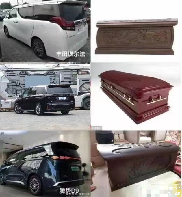不过,这并非无解。试想,如果所有的MPV都被与“棺材”挂上钩,大家都一样了也就没有什么说的了吧。不知道是谁经过高人指点开动了宣传小机器,还是网友自发行动,不仅是小鹏X9,MPV市场中的热门选手都被冠上强行与棺材扯上联系。所以,一张图很快流行开来,丰田埃尔法、腾势D9等车都被与各式各样的形状各异的棺材挂上钩。