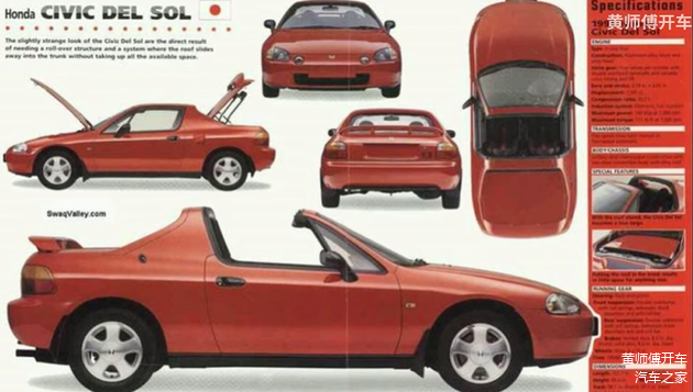 五代思域的衍生车型进一步缩减,只保留两厢掀背、三厢COUPE和普通三厢版,取消了前几代的旅行版本,但却增加了一款名为DelSol的敞篷版,非常有那个年代日本小跑车的味儿。