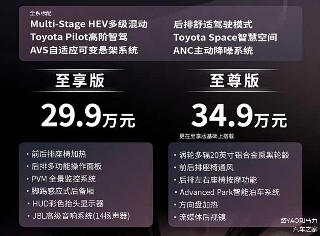 至享版与至尊版之间的配置差异方面,先说标配,全新一代皇冠Sedan标配有Toyota Pilot高阶智驾、AVS自适应可变悬架系统、后排舒适驾驶模式、Toyota Space智慧空间、ANC主动降噪系统、前后排座椅加热、后排多功能操作面板、PVM全景监控系统、脚踢感应式后备厢、HUD抬头显示、14扬声器JBL品牌音响等,结合至享版29.9万元的售价来看,标配依然十分丰富,完全可以满足驾驶所需。