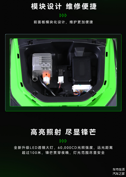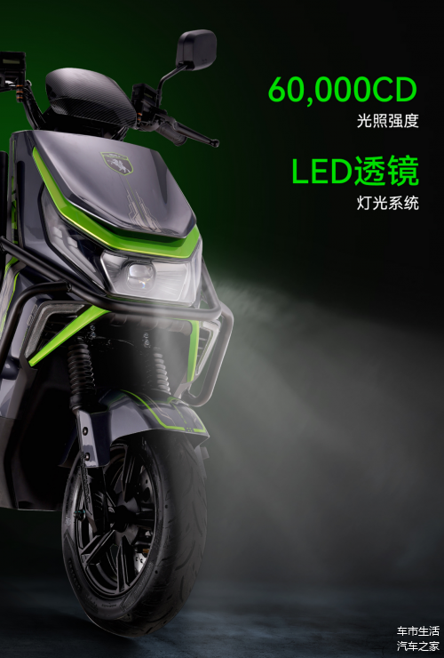 外卖小哥用车频次高,用车场景更复杂,安全对于外卖小哥来说至关重要。灯是守护外卖小哥夜间出行的重要保障,整车采用全新升级LED透镜大灯,具备60000CD光照强度,远光距离超过100米,更亮的夜间照明,让用户夜间行驶更安全。