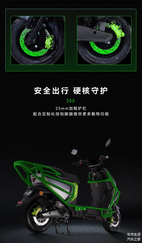 此外,整车采用全包围式的原厂25mm护杠,从头到尾,钢筋铁骨,无死角保护。综上来看,这款车真正做到全方位守护外卖小哥出行安全。