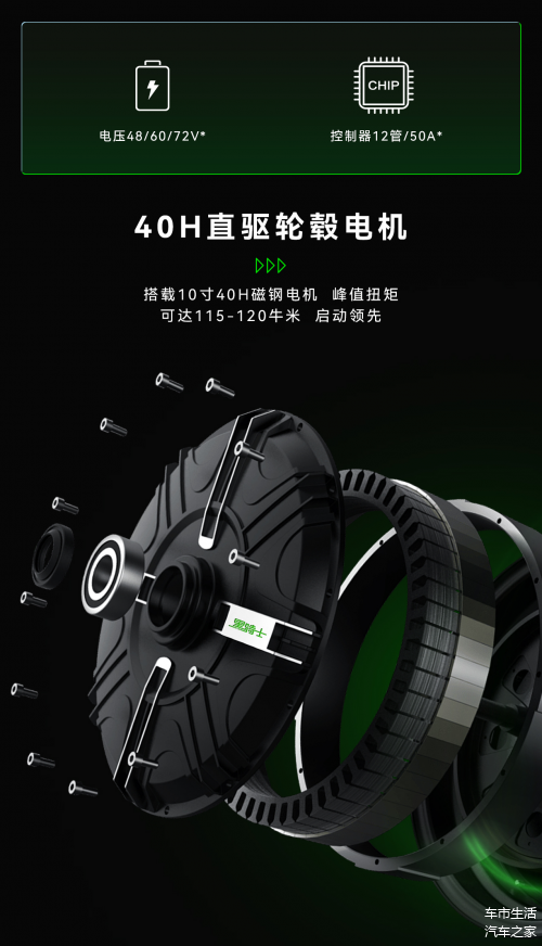 续航、动力、智能是影响消费者购买决策的重要因素。动力配置方面,整车配置40H的磁钢轮毂电机,峰值扭矩可达115-120牛米,确保整车兼具提速快和动力强的特性,能轻松过坡。整车内置超大电池仓,可适配市面上大多数换电电池,配合12管50A控制器,确保整车提速快,动力更强。