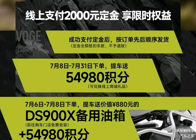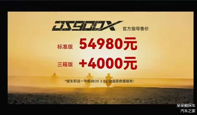2024款无极DS900X作为一款国产的ADV探险车,标准版官方指导价为54980元,三箱版指导价为58980元。无极官方还推出,在7月31日前购车就送54980积分,并且还送一年极屿OS 3.0主动道路救援服务。此外,新车还提供秘境黑和贡嘎银两种车身配色可选,满足不同消费者的审美需求。