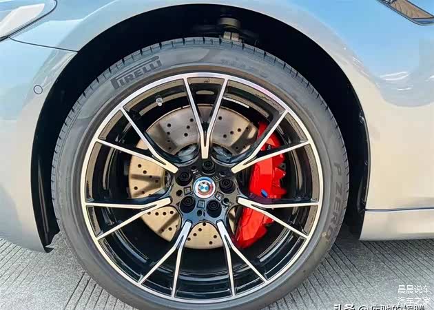 作为一台V8版本的5系轿车,M5的外观确实非常低调,双肾格栅上的M5徽标,激光大灯,才令人猛然醒悟,这可不是普通的5系,展车用的是石青色车漆,轮胎是P-ZERO,内置红色涂装的M复合制动卡钳,Y式轮辐789M型双色轮毂,20英寸铝合金轮圈,车顶是带有导流线的碳纤维车顶。