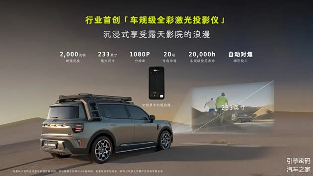 与此同时,这款车还行业首创配备了以影院规格为标准打造的车规级全彩激光投影仪,最大233英寸超清画面,达到1080P限时效果,带来沉浸式观影体验。