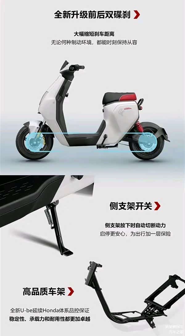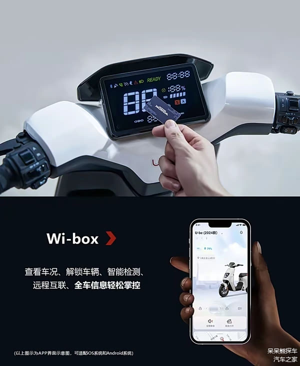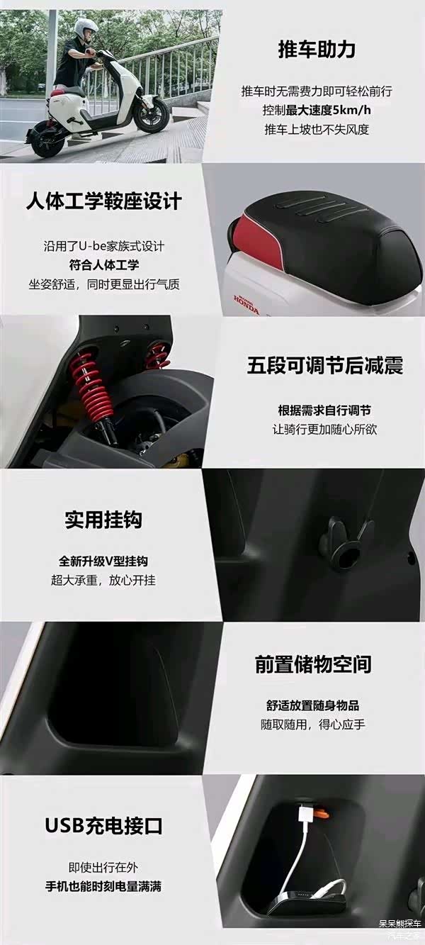 五羊本田2024款U-be共推出了3款配置,主要区别为电池容量、后轮刹车、无钥匙启动、手机连接等。3款车型的标配有五段可调节后减震、前置挂钩、车头储物空间、全车LED灯光、USB充电口、电子油门、辅助推车、定速巡航、能量回收、P挡控制、制动断电、边撑断电等功能。低中车型的刹车系统为前碟后鼓,高版车型为前后双碟刹。全彩仪表能够实时显示电量、车速、时间、车辆状态等关键信息,中高版车型的全彩色仪表内置Wi-box系统,可以在手机上随时查看车况,并能解锁车辆、智能检测、远程互联等,还支持三种解锁方式,分别是NFC、App、蓝牙。