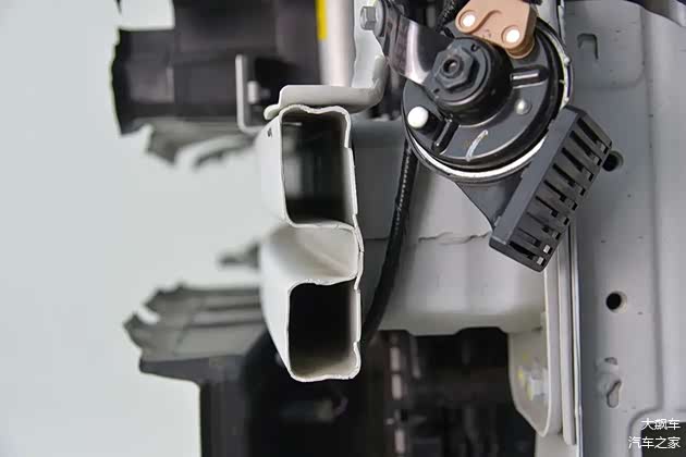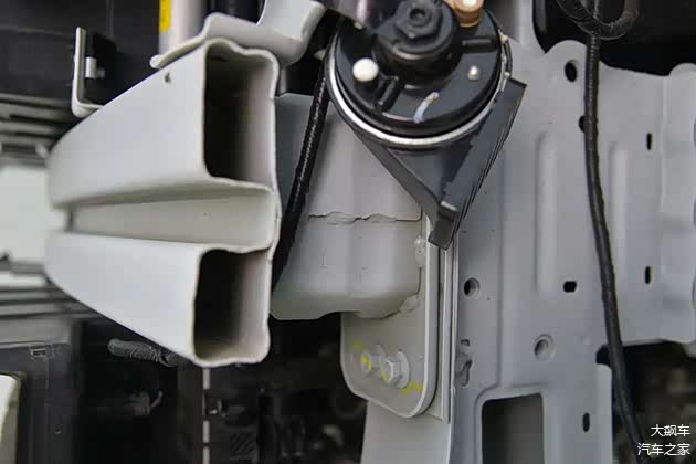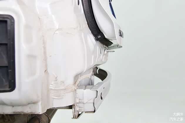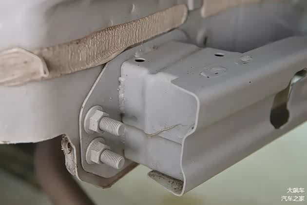 纵梁前端使用了溃缩诱导,与二代车型保持一致。一代车型上有应对25%偏置碰撞测试的诱导推块,而二代三代上都没有了。