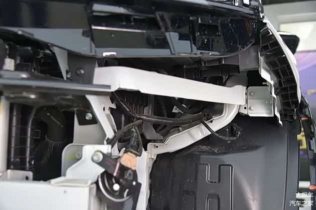 之前拆一代CS75PLUS时,就看到水箱前面有一根圆管梁,二代和三代车型依旧保留了下来。因为进气格栅面积大,需要有一根梁进行支撑,不至于被轻易按瘪。