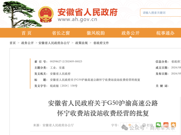 近日,安徽省人民政府网站发布《安徽省人民政府关于G50沪渝高速公路怀宁收费站设收费经营的批复》,同意在G50沪渝高速公路设立怀宁收费站,由安徽省交通控股集团有限公司经营管理,站名为“怀宁收费站”(位于K533+075M处)。