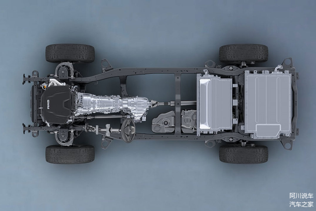 值得一提的是,Hi4-Z把大容量驱动电池,布置在了大梁内部,位于前后车桥之间。选择在这个位置放电池,虽然无法布局传动轴,但扩大了电池容量。根据官方数据显示,Hi4-Z的纯电续航里程高达200Km以上。不得不说,这就是奔着强动力、低油耗去的。